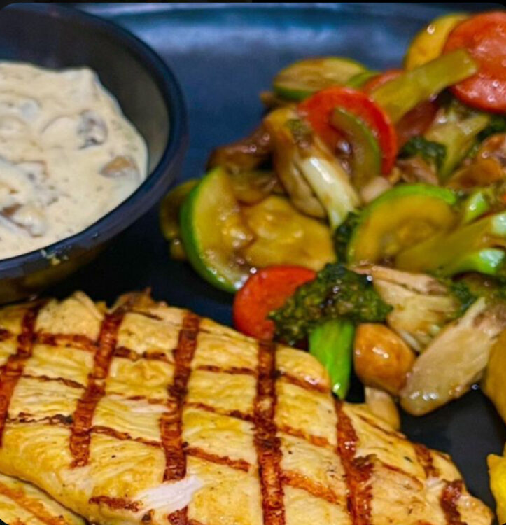 پوره سیب زمینی دورچین سبزیجات استیک مرغ سس قارچ سبزیجات مزه دارشده