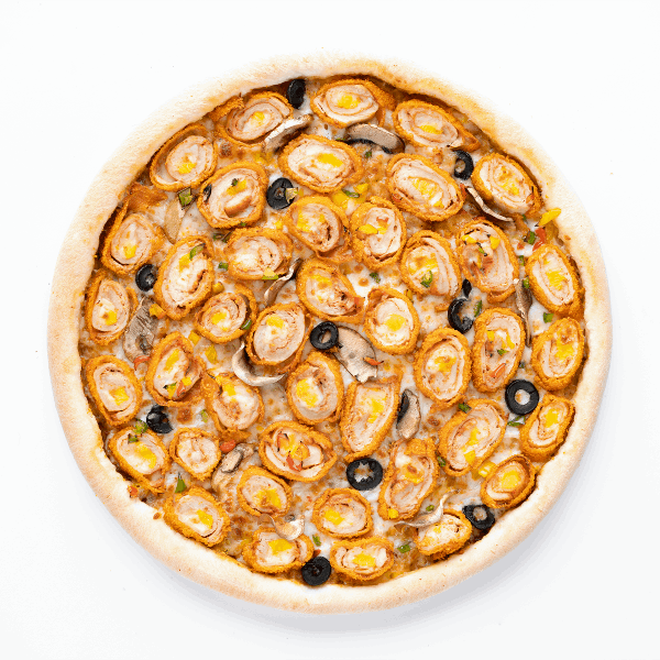 سینه مرغ پنیری سوخاری شده قارچ پنیر گوجه گیلاسی زیتون ذرت فلفل دلمه ای
